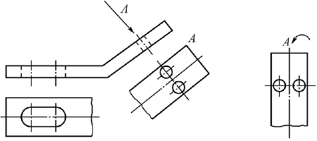斜視圖的畫(huà)法和標(biāo)注法與局部視圖相同,有時(shí)也可將圖形擺正來(lái)表示,見(jiàn)圖中的A”(標(biāo)注在圖形上方)。